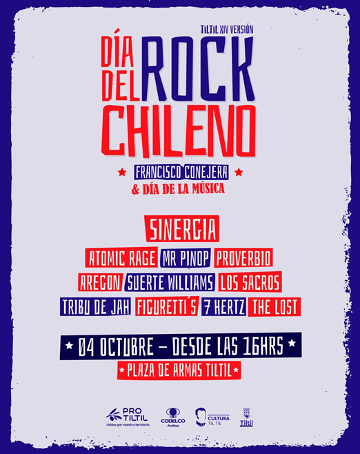El sábado 4 de octubre de 2025, la Plaza de Armas de Tiltil será el epicentro de la XIV versión del Día del Rock Chileno “Francisco Conejera”, una fiesta musical que desde el año 2011 se ha consolidado como uno de los hitos culturales más importantes de la comuna. Si bien la fecha de esta celebración es el día 15 de agosto, se reagendó por condiciones climáticas.